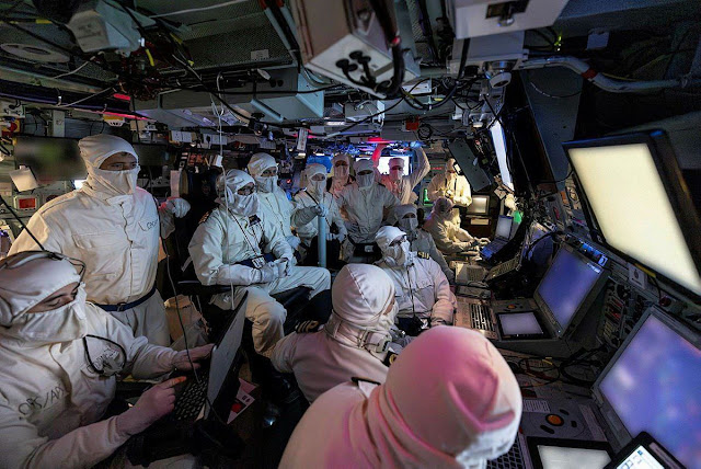 vemos estas fotos del destructor que tal vez haya sido un Arleigh Burke, la ultima muy rara los tripulantes con trajes anti ataque quimico??