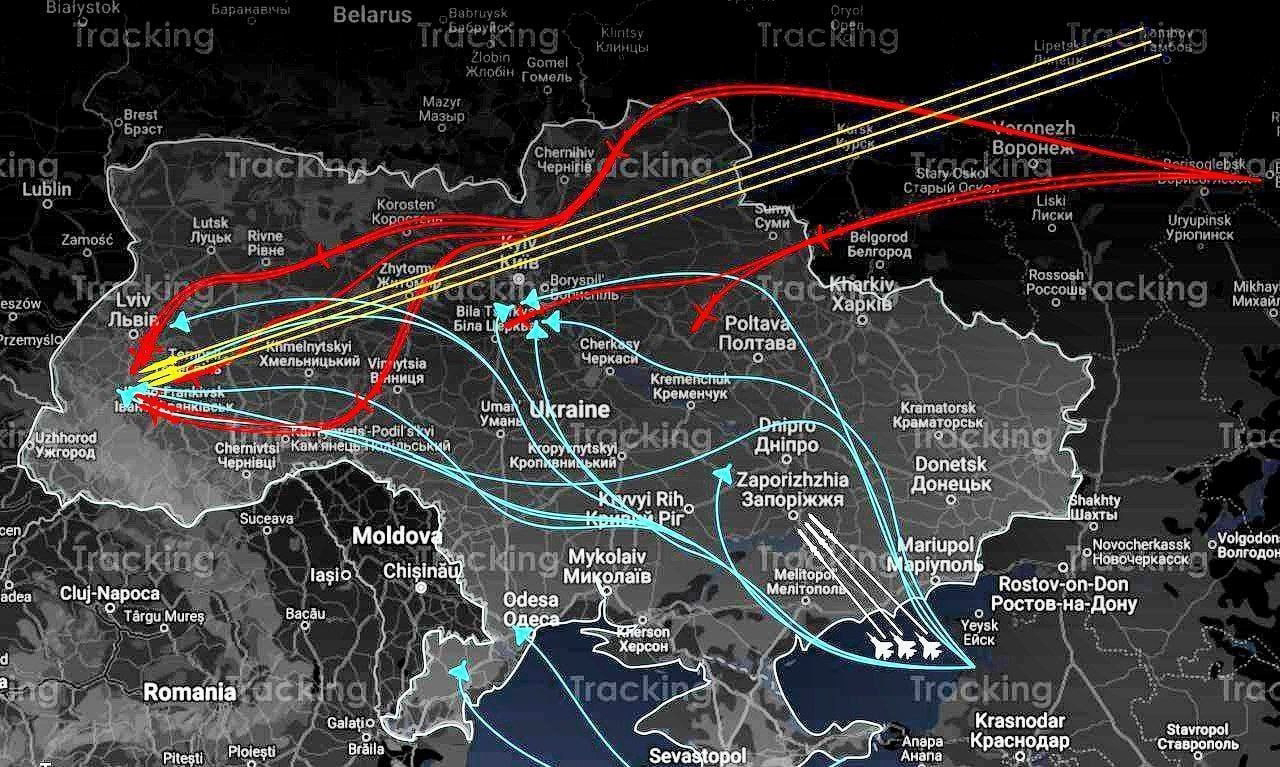 Mapa de rutas de vuelo aproximadas de drones kamikaze Guerán-2, así como de misiles de crucero e hipersónicos, que hoy atacaron infraestructura energética de Ucrania en varias regiones simultáneamente.